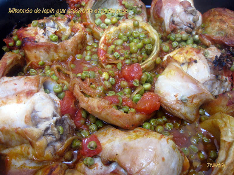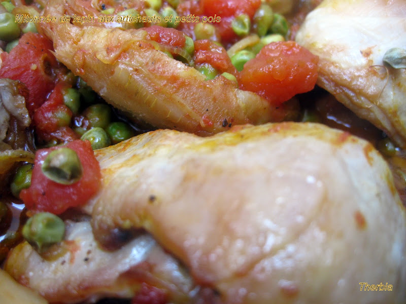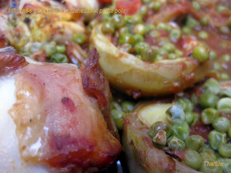 En parcourant la blogosphère je suis tombée sur un blog plein de bonnes recettes et de belles photos parmi lesquelles j'ai déniché cette recette de lapin, ça tombait bien, j'avais des petits pois et des fonds d'artichauts au congélateur, y'avait plus qu'à trouver le lapin ..